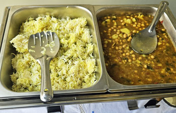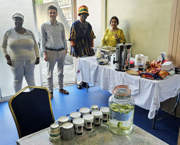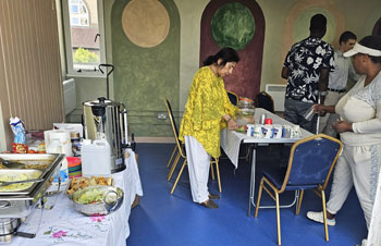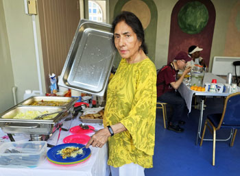 Our dedicated volunteer team—Annabel, Roberto, and George—joins Harminder in warmly serving delicious meals to our cherished members.